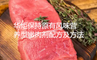 华炬科技新产品研究所技术咨询委员会科研人员现推荐一项一种保持原有风味营养型嫩肉剂配方及方法,该技术的目的在于提供一种营养型嫩肉剂,该营养型嫩肉剂可以使肉在烹饪中嫩化的同时保持原有风味。同时还可以起到补钙的作用,该技术的营养型嫩肉剂具备以下优点:1. 该技术的嫩肉剂利用钙离子能激活肉中内源酶的作用,用高浓度的钙离子激活肉中自有的蛋白质分解酶,从而达到使肉变嫩的目的。由于该技术嫩肉剂的真正作用因子来源于肉自身,因此可以使肉保持自有风味的同时达到膳食补钙的目的,使人们在享受美味佳肴的同时不知不觉获得适量的钙质。2. 该技术的嫩肉剂较以往所用的营养型嫩肉剂不同点在于,无小苏打,碳酸钾等破坏VB族元素的缺点,可大量保护B族维生素,又不会使肉变糟失香,现将该一种保持原有风味营养型嫩肉剂配方及方法及技术方案及实施例介绍如下供研究交流参考:(311241 321267)